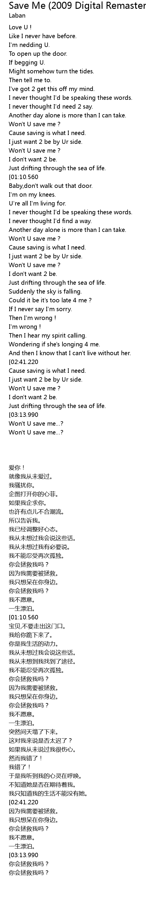 | [02:33.000][02:41.220] | Won' t U save me ? |