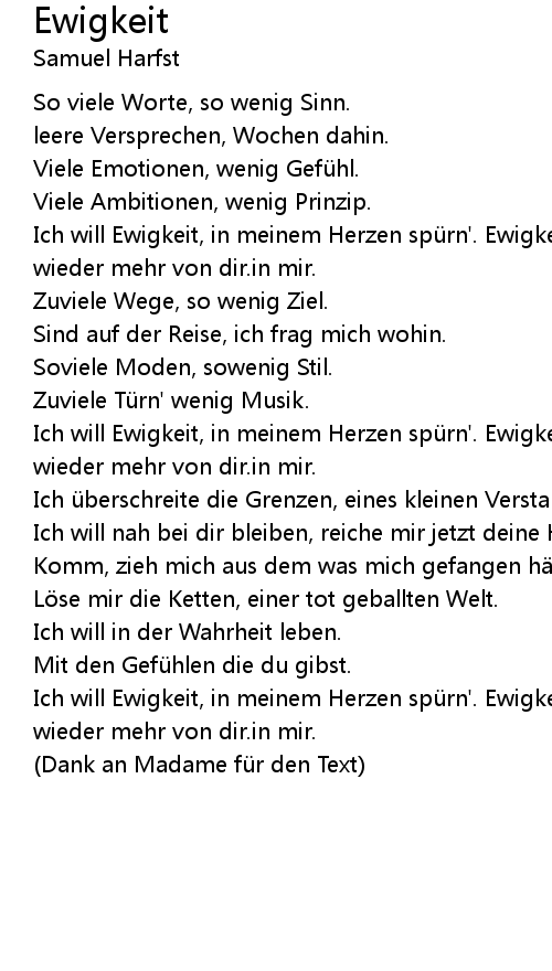 | Ich will Ewigkeit, in meinem Herzen spü rn'. Ewigkeit. Ich will Ewigkeit, will wieder mehr von dir. in mir. | |