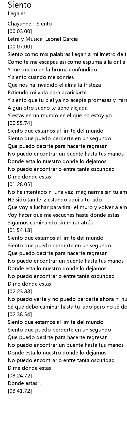 | [00:16.47] | Siento como mis palabras llegan a mili metro de ti y se esfuman |
