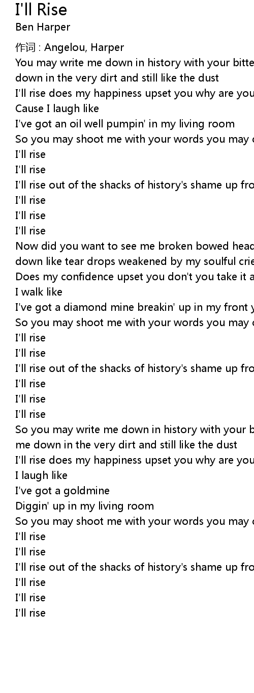 | You may write me down in history with your bitter twisted lies you may tread me down in the very dirt and still like the dust | |
