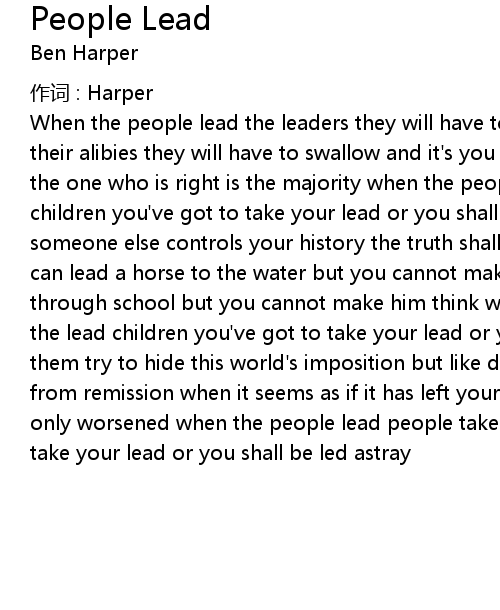 | When the people lead the leaders they will have to follow and all their lies and their alibies they will have to swallow and it's you that has the authority for the one who is right is the majority when the people lead people take the lead children you've got to take your lead or you shall be led astray so as long as someone else controls your history the truth shall remain just a mystery for you can lead a horse to the water but you cannot make him drink you can put a man through school but you cannot make him think when the people lead people take the lead children you've got to take your lead or you shall be led astray watch them try to hide this world's imposition but like disease that has come round from remission when it seems as if it has left your person all the while it has only worsened when the people lead people take the lead children you've got to take your lead or you shall be led astray |