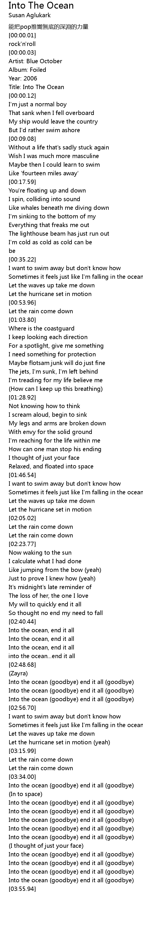 | [03:51.91] | Into the ocean goodbye end it all goodbye |