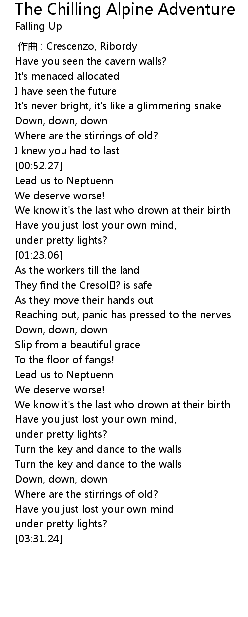 | [00:31.47] | It's never bright, it's like a glimmering snake |