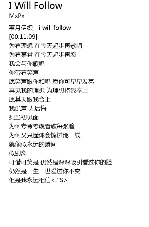 | [00:04.26] | wei yue yi zhi i will follow |
