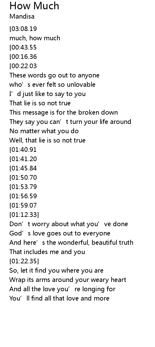| [03:10.68][03:08.19][03:05.68][03:01.28][02:58.32][02:56.23][01:34.61][01:31.96][00:42.24][00:12.48] | How much, how much |