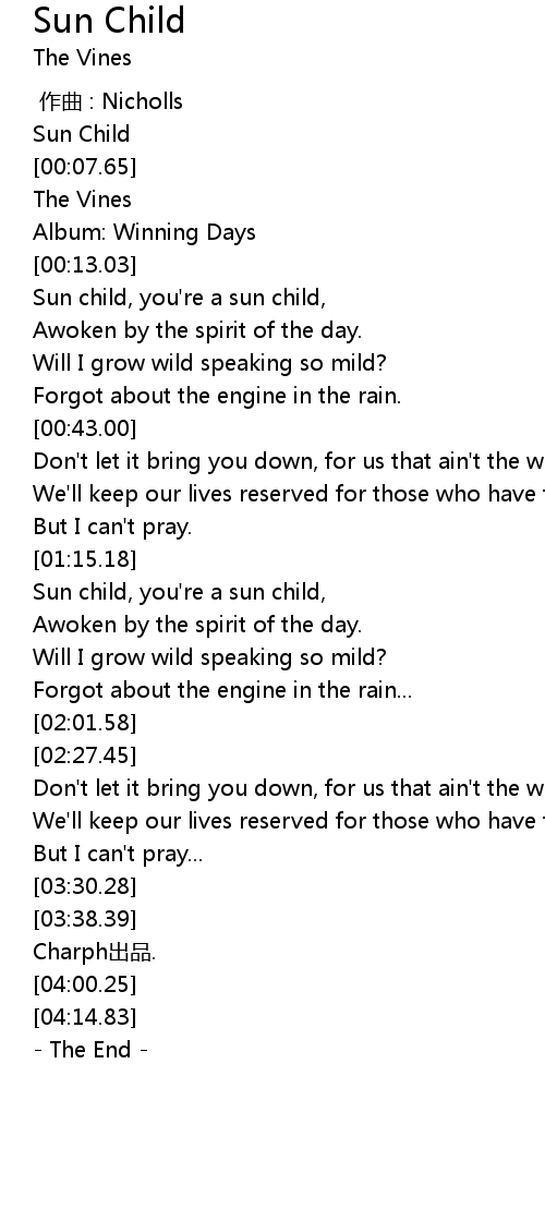 | [02:55.71] | Don' t let it bring you down, for us that ain' t the way. |
