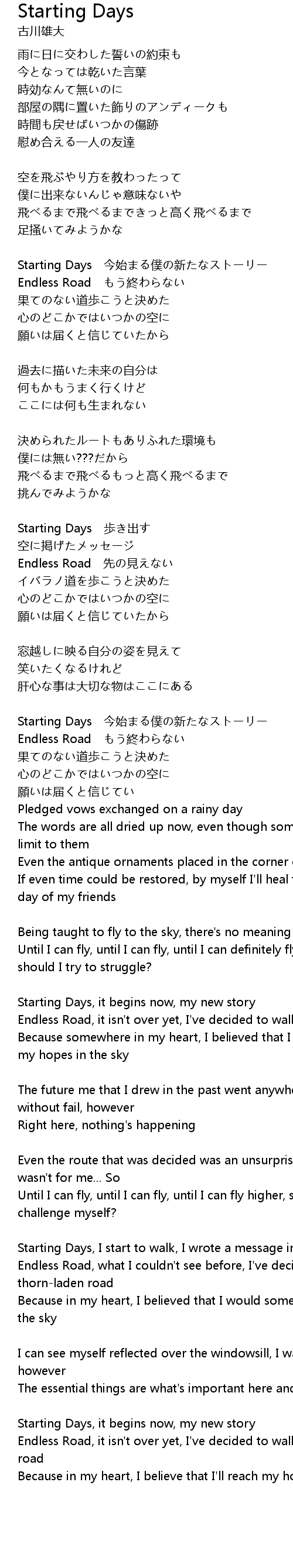 | [01:10.69] | Starting Days 今始まる僕の新たなストーリー |