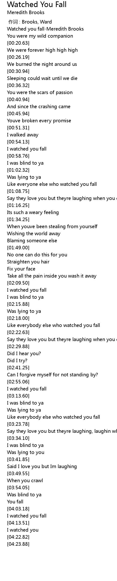 | [00:01.07] | Watched you fallMeredith Brooks |