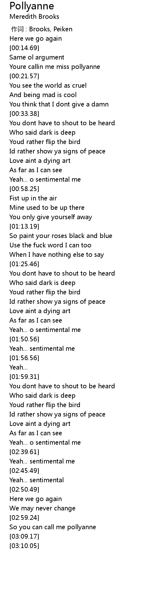 | [03:02.86] | So you can call me pollyanne |