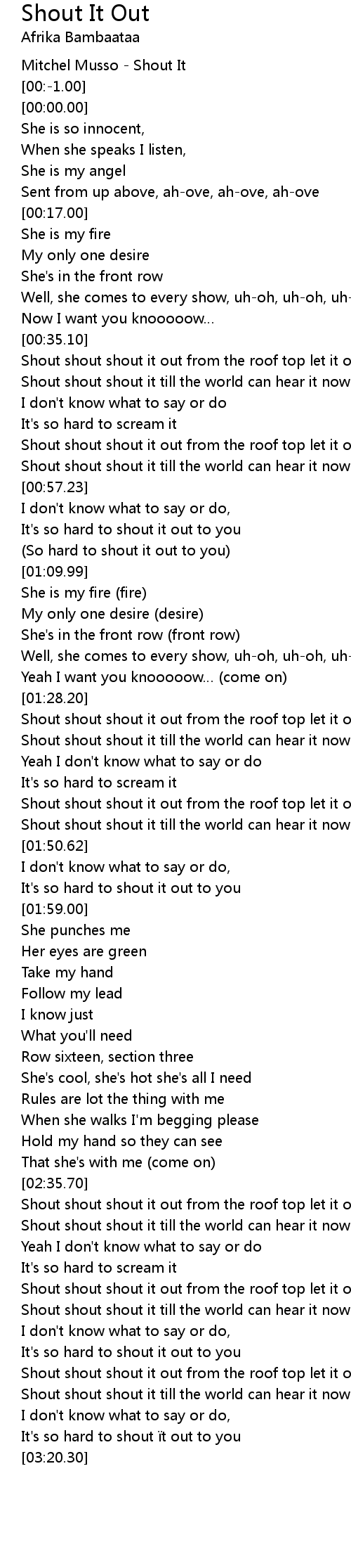 | [02:36.65] | Shout shout shout it out from the roof top let it out |