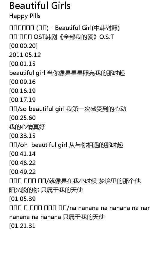 | [02:09.09][00:33.15] | oh beautiful girl 그대를 처음 만난 그 순간 부터/oh beautiful girl 从与你相遇的那时起 |