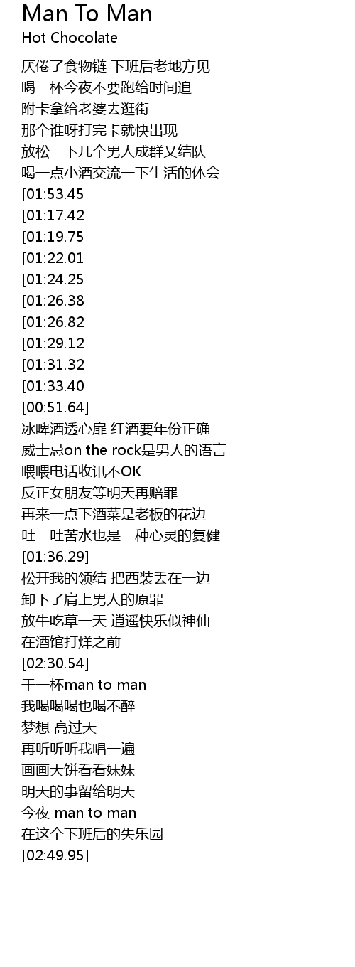 | [02:11.78][01:17.42][00:31.98] | 干一杯man to man |