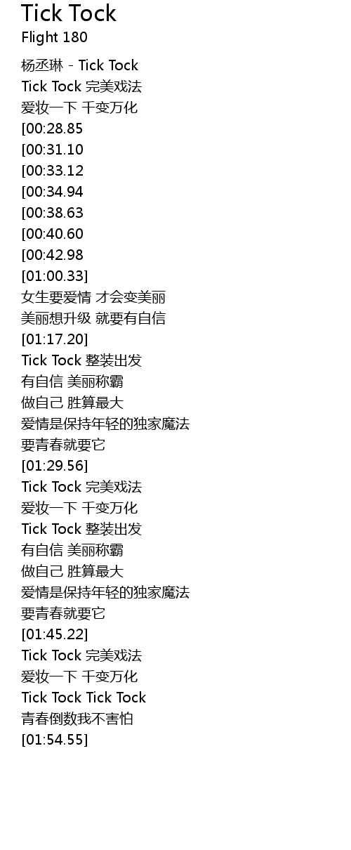| [00:44.84][00:28.85] | Tick Tock 整装出发 |