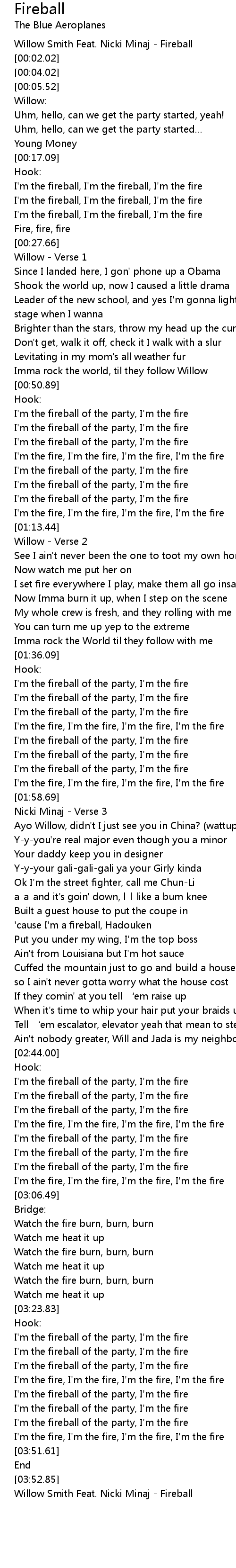 | [00:00.02] | Willow Smith Feat. Nicki Minaj Fireball |