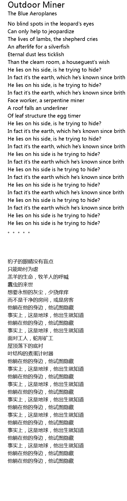 | [00:59.27] | He lies on his side, is he trying to hide? |
