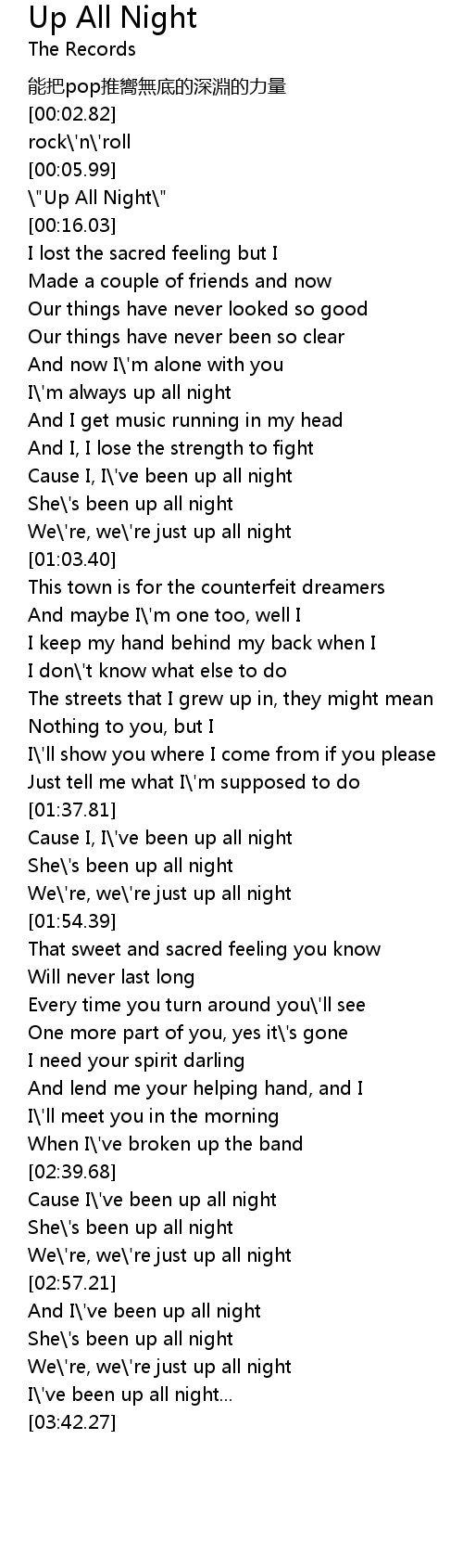 | [00:46.59] | Cause I, I\'ve been up all night |
