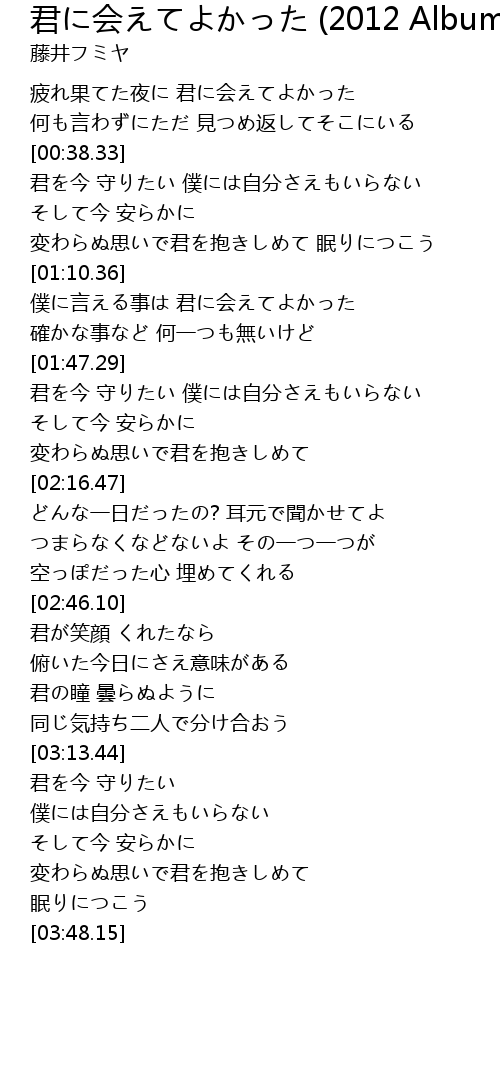 | [00:14.74] | 疲れ果てた夜に 君に会えてよかった |