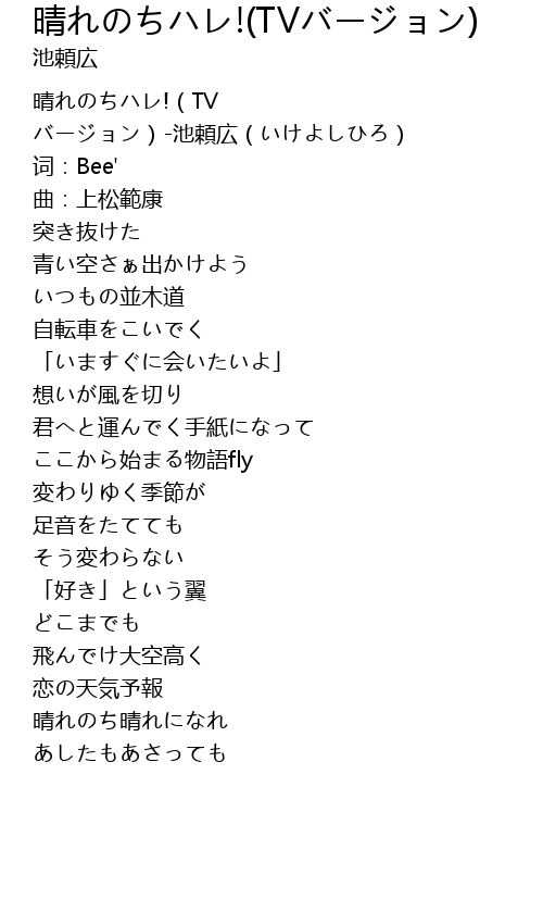 | [00:00.491] | 晴れのちハレ!(TV バージョン)-池頼広(いけよしひろ) |