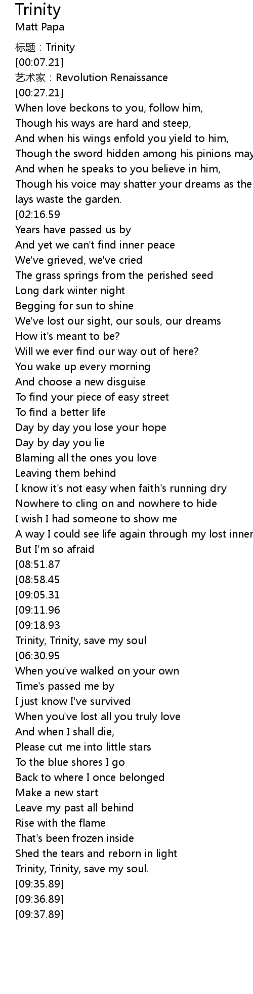 | [09:25.89] | Trinity, Trinity, save my soul. |