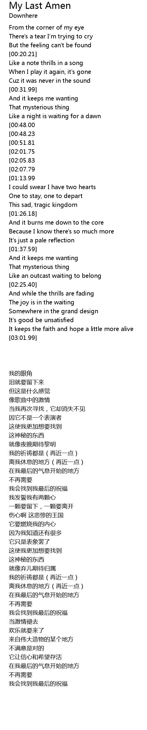 | [03:29.05][02:07.79][01:01.59] | And I will find my last Amen |