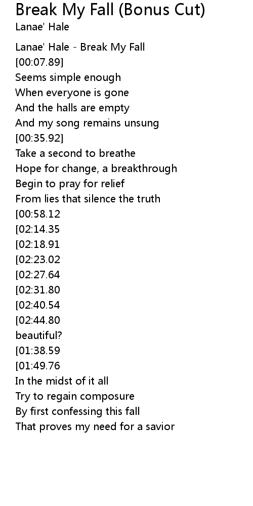 | [00:01.12] | Lanae' Hale - Break My Fall |