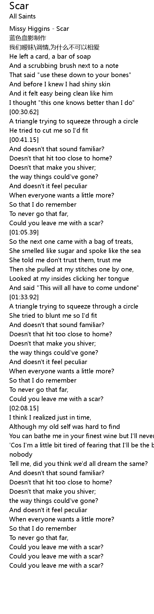 | [00:02.34] | Missy Higgins Scar |