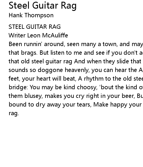 Been runnin' around, seen many a town, and maybe you'll find I'm the kind of guy that brags. But listen to me and see if you don't agree No melody rolls like that old steel guitar rag And when they slide that thing, along those strings It sounds so doggone heavenly, you can hear the Angels sing And when you stomp your feet, your heart will beat, A rhythm to the old steel guitar rag Break or bridge: You may be kind choosy, 'bout the kind of songs you hear, You maybe like them blusey, makes you cry right in your beer, But if you want a song that's bound to dry away your tears, Make happy your soul with that old steel guitar rag. |