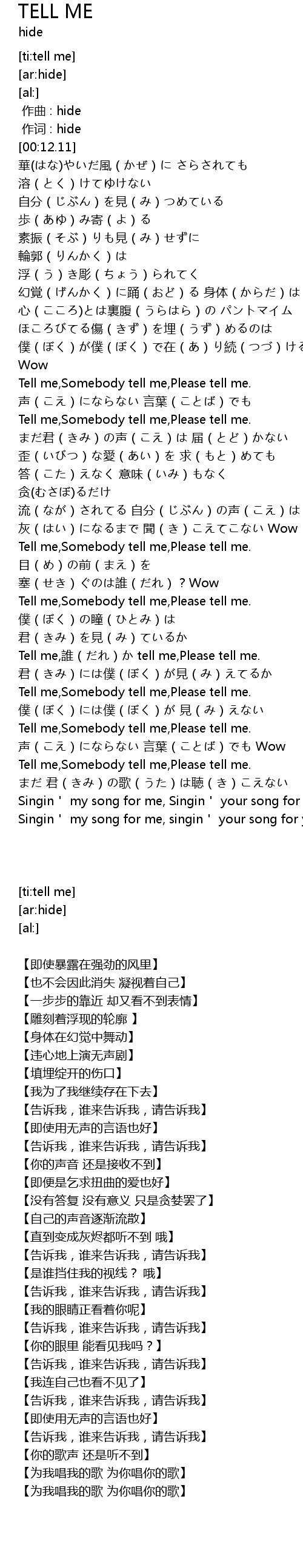 | [03:11.19] | Tell me,Somebody tell me,Please tell me. |