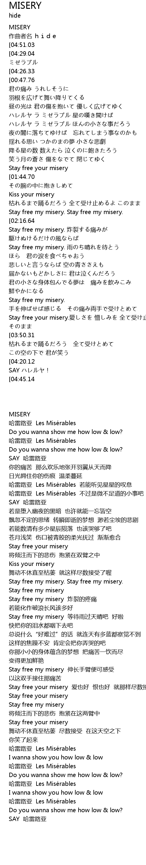 | [04:34.75][04:29.04][04:22.87][04:17.92][00:41.66][00:36.33] | ハレルヤ ラ ミゼラブル |
