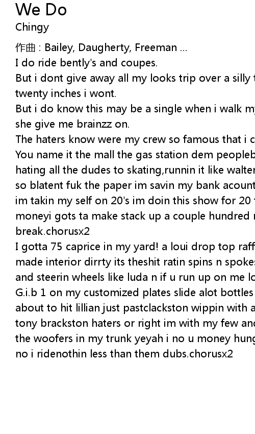 | G. i. b 1 on my customized plates slide alot bottles dont never come fake.. im about to hit lillian just pastclackston wippin with a peice thats better than tony brackston haters or right im with my few and team bumpsi got the 3 amps and the woofers in my trunk yeyah i no u money hungry hoes wanna roll with trick u no i ridenothin less than them dubs. chorusx2 |