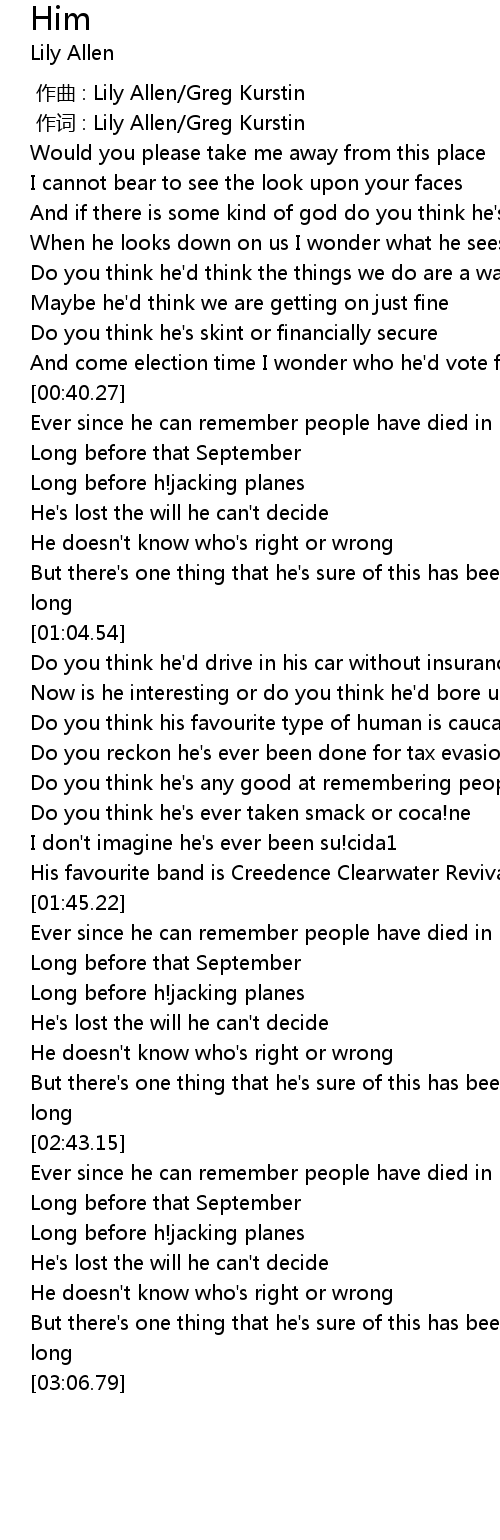 | [00:00.30] | 作词 : Lily Allen/Greg Kurstin |