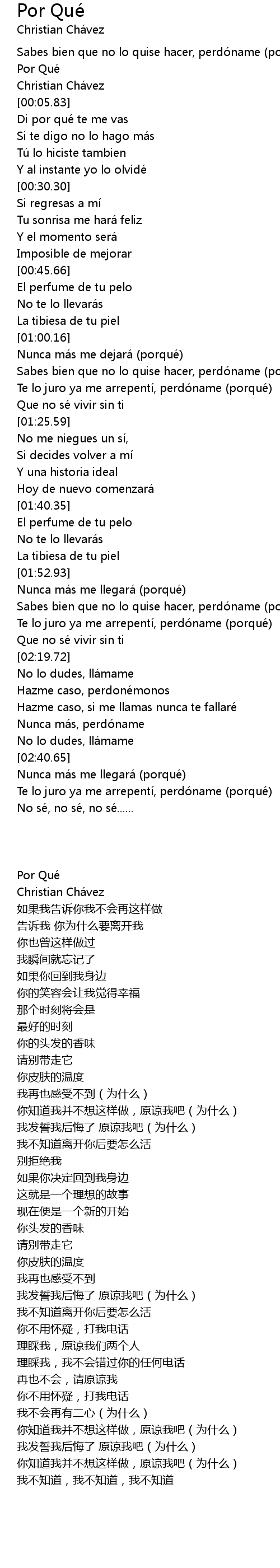 | [02:53.71] | Te lo juro ya me arrepentí, perdó name porqué |