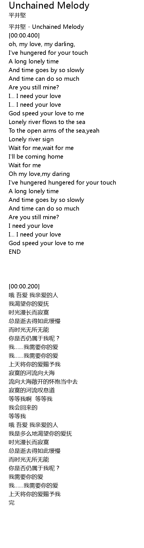 | [00:00.200] | píng jǐng jiān Unchained Melody |