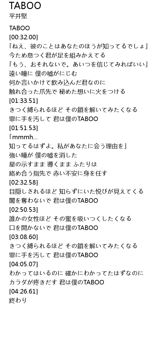 | [04:14.68] | カラダが疼きだす 君は僕のTABOO |