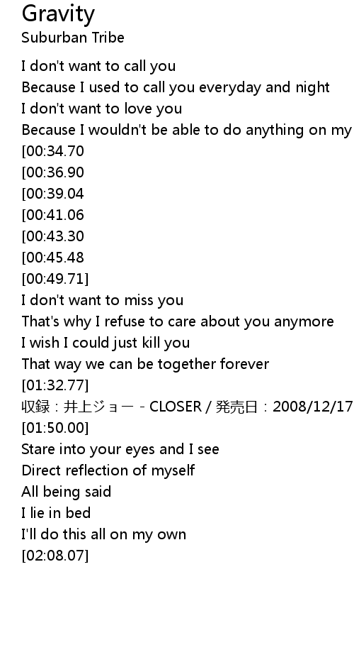 | [01:17.82][00:34.70] | Gravity starts to pull me down a little |