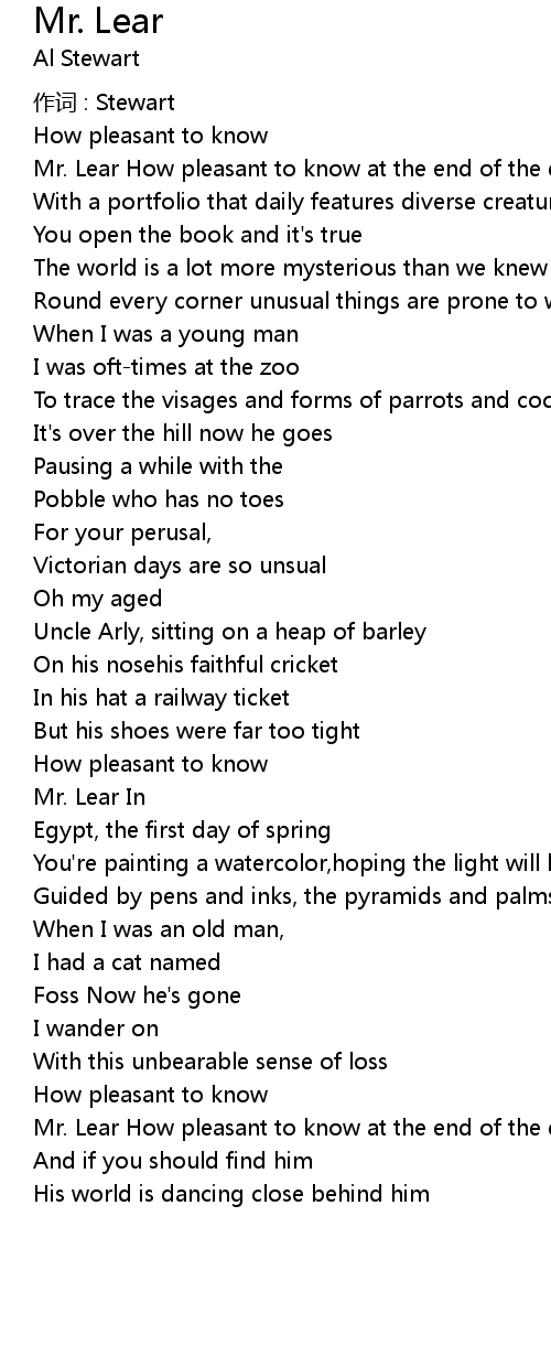 | Mr. Lear How pleasant to know at the end of the day he' s near | |