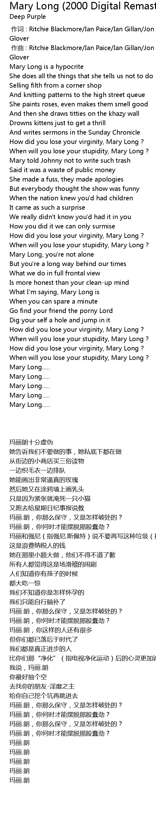 | [00:49.74] | When will you lose your stupidity, Mary Long ? |