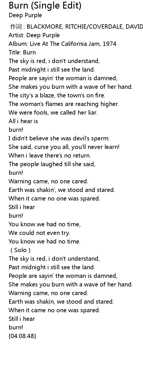 | [00:00.00] | 作词 : BLACKMORE, RITCHIE/COVERDALE, DAVID/LORD, JON/PAICE, IAN |