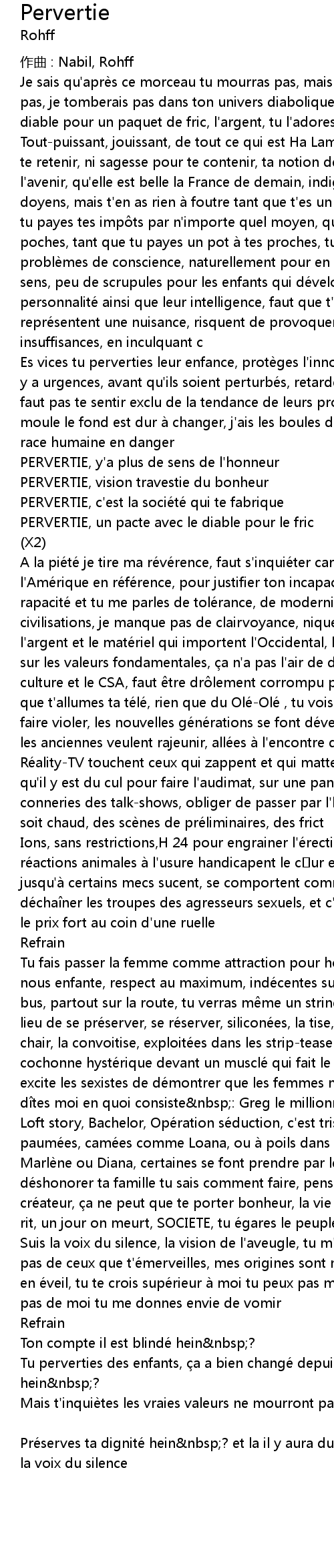 | A la pie te je tire ma re ve rence, faut s' inquie ter car SOCIETE prend l' Ame rique en re fe rence, pour justifier ton incapacite de bienveillance, ta rapacite et tu me parles de tole rance, de modernisation, de nouvelles civilisations, je manque pas de clairvoyance, nique la mondialisation, c' est l' argent et le mate riel qui importent l' Occidental, le superficiel l' emporte sur les valeurs fondamentales, a n' a pas l' air de de ranger le ministre de culture et le CSA, faut tre dr lement corrompu pour laisser faire a, de s que t' allumes ta te le, rien que du Ole Ole , tu vois la pudeur entrain de se faire violer, les nouvelles ge ne rations se font de vergonde es par Arthur, et les anciennes veulent rajeunir, alle es a l' encontre de la nature, les Re alityTV touchent ceux qui zappent et qui mattent, les producteurs souhaitent qu' il y est du cul pour faire l' audimat, sur une pancarte applaudissez les conneries des talkshows, obliger de passer par l' humour obsce ne pour que a soit chaud, des sce nes de pre liminaires, des frict | |