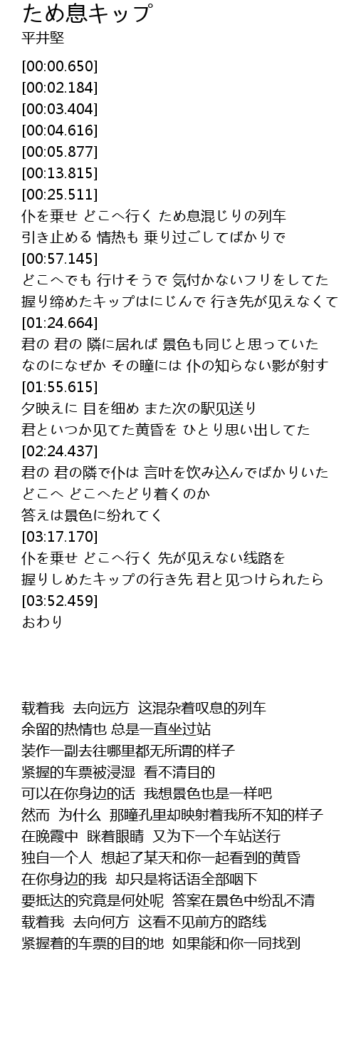| [00:30.501] | 仆を乗せ どこへ行く ため息混じりの列车 |