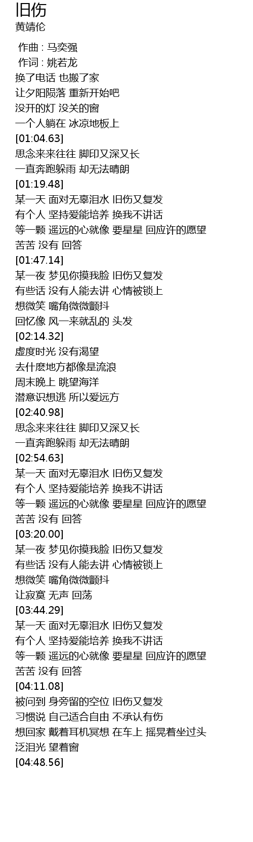 | [01:47.67] | 某一夜 梦见你摸我脸 旧伤又复发 |