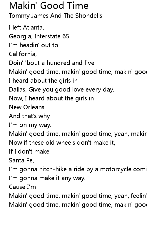 Makin' good time, makin' good time, yeah, feelin' so fine. |