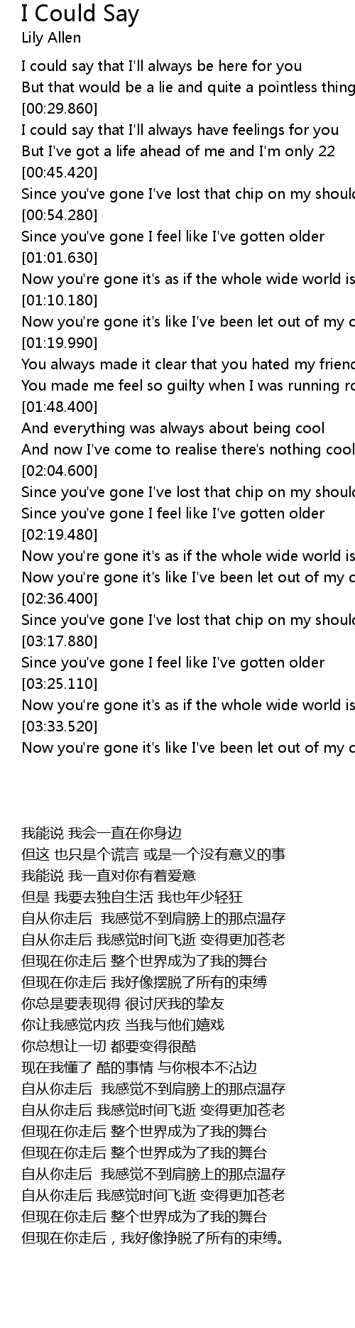 | [03:18.440] | Since you've gone I feel like I've gotten older |