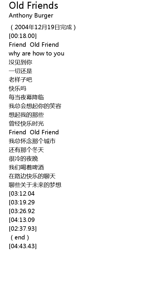 | [04:05.50][03:26.92][02:17.68] | Friend Old Friend |