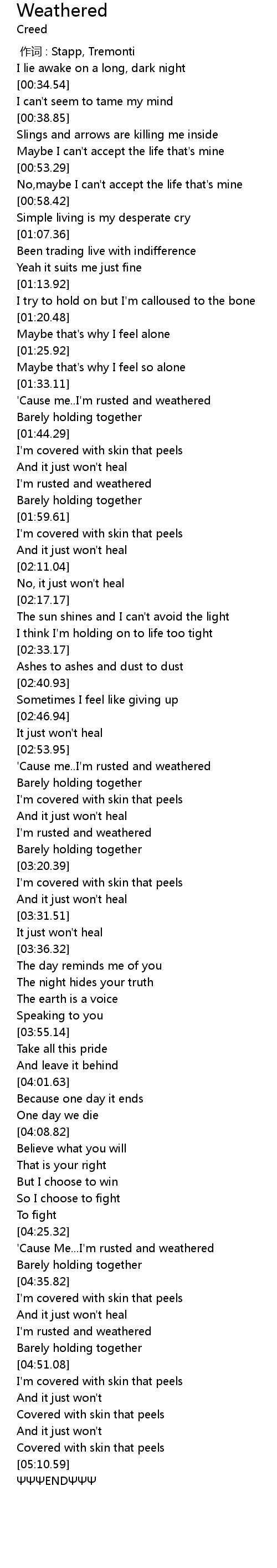 | [04:27.33] | 'Cause Me...I'm rusted and weathered |