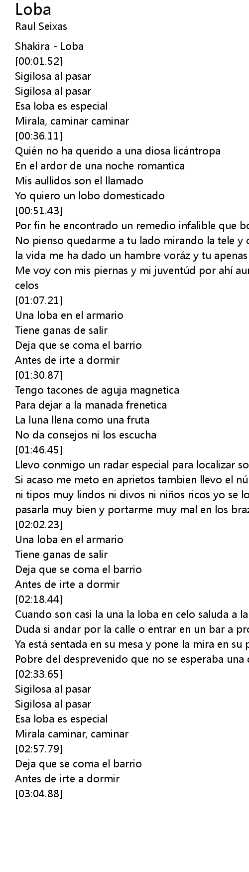 | [02:18.94] | Cuando son casi la una la loba en celo saluda a la luna |