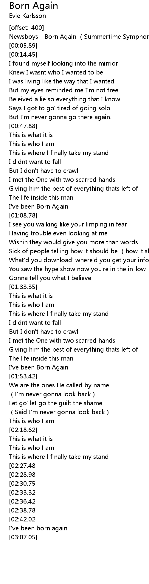 | [02:55.75][02:38.78] | I've been Born Again |