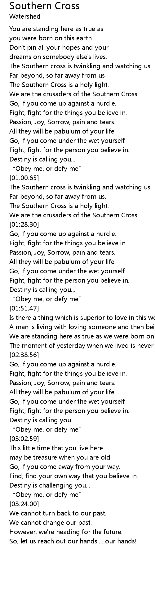 | [01:24.07] | We are the crusaders of the Southern Cross. |
