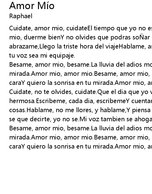 | Cuidate, amor mio, cuidateEl tiempo que yo no estare contigo. Duerme bien, amor mio, duerme bienY no olvides que podras so ar conmigo. Abrazame, amor mio, abrazame, Llego la triste hora del viajeHablame, amor mio, hablame, Que quiero que tu voz sea mi equipaje. | |