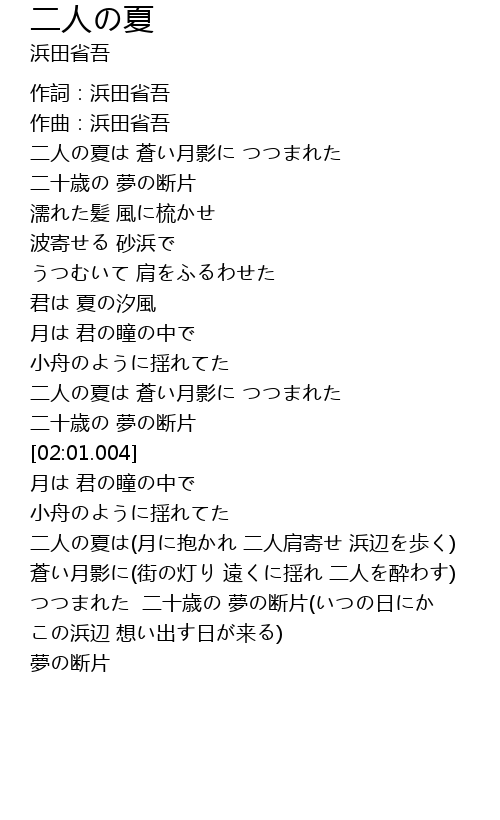 | [03:05.128] | 二人の夏は(月に抱かれ 二人肩寄せ 浜辺を歩く) |